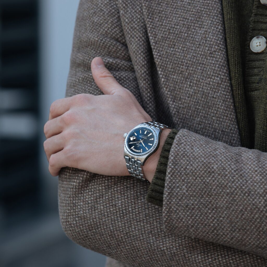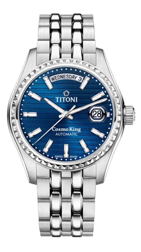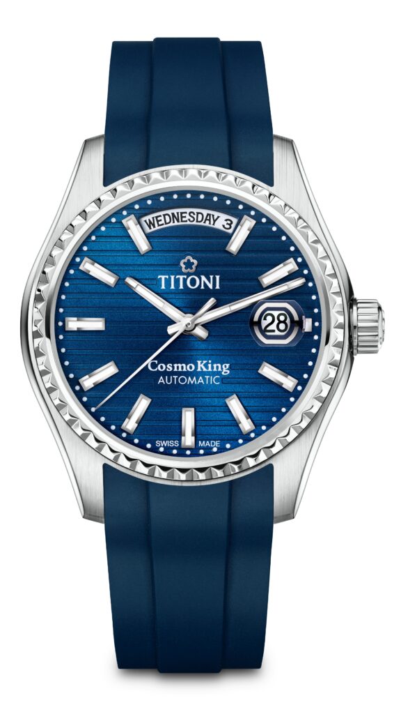 Beide Uhrenvarianten überzeugen mit kleinen, liebevollen Details, wie den aufgesetzten Indizes und der sorgfältig bearbeiteten Krone mit dem fein ausgearbeiteten Titoni-Logo, der Pflaumenblüte. Für die Cosmo King mit blauem Zifferblatt steht außerdem alternativ zum Stahlband auch ein passendes Kautschukband zur Verfügung, das perfekt zur sportlichen Seite der Uhr passt.