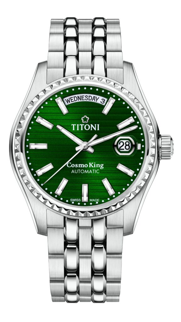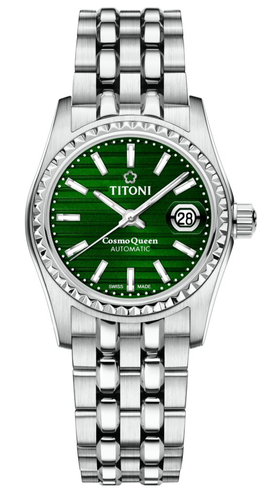 Titoni präsentiert mit den neuen „Cosmo“ Modellen eine Uhrenserie für den perfekten Partnerlook, mit dem Herrenmodell „Cosmo King“ in 40 mm Größe und dem Damenmodell „Cosmo Queen“ in 27 mm Größe. Besonderer Eyecatcher der Cosmo Uhren ist das Zifferblatt mit seinen markanten, horizontal geprägten Vertiefungen, die den Zeitmessern einen klaren, architektonischen Charakter verleiht. Auch die kannelierte Lünette greift Spiel der Formen aus dem Zifferblatt auf und verstärkt die sportlich-elegante Ausstrahlung. Leuchtstarke Stundenindizes mit Superluminova sorgen auch bei Dunkelheit für beste Ablesbarkeit. Der Cosmo King und die Cosmo Queen sind jeweils mit grünem oder blauem Zifferblatt erhältlich, die kräftigen Farben sorgen für zusätzliche Attraktivität am Handgelenk.