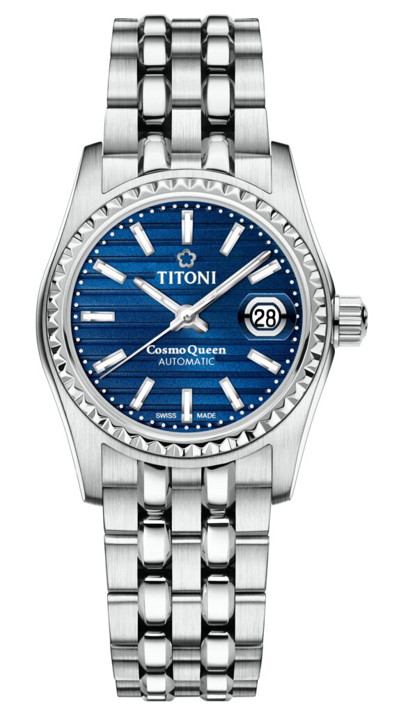 Das Damenmodell Cosmo Queen fällt mir 27 mm Durchmesser kleiner aus, doch steht es – typisch für Titoni – dem Herrenmodell bei der Ausstattung in nichts nach: Mit entspiegeltem Saphirglas, Wasserdichtigkeit bis 100 Meter, verschraubter Krone, einem fünfreihigen Edelstahlband mit satinierten und polierten Gliedern und einem Automatikwerk von Sellita, bietet es eine dem Herrenmodell ebenbürtige Wertigkeit.