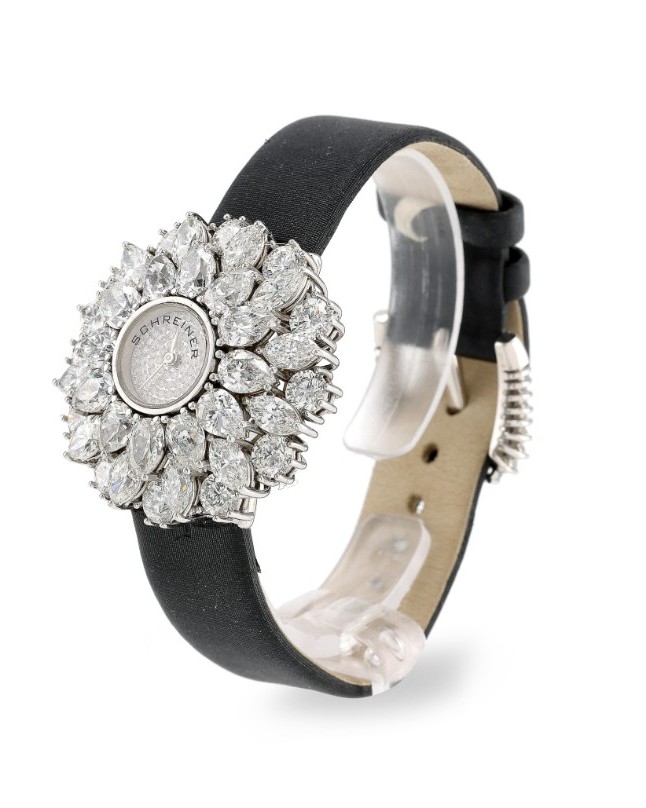 Neben wunderschönem Schmuck besaß Dr. Antje-Katrin Kühnemann auch eine Auswahl an besonderen Uhren, die den Charakter eines Schmuckstücks aufweisen. Dazu gehört ein Modell der Firma Schreiner im Design einer diamantenbesetzten Blüte rund um das Zifferblatt, das ebenfalls mit Diamanten besetzt ist. Das Uhrenband besteht aus schwarzem Stoff. Der Schätzwert für diese Uhr liegt bei 12.000 bis 18.000 Euro.