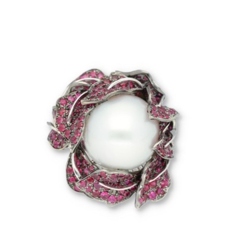 Unter den Schmuckstücken, die Frau Dr. Kühnemann in ihrer Lebenszeit sammelte, befinden sich nicht nur Designs mit Farbedelsteinen und Diamanten, sondern auch eleganter Perlenschmuck. Ein Highlight ist dieser besondere Ring aus Weißgold im Blütendesign aus Rubinen mit einer Südseeperle in der Mitte. Der Ring wurde von der Firma Schreiner gefertigt, ihm liegt ein Zertifikat bei. Der Schätzwert liegt bei 4.000 bis 6.000 Euro.