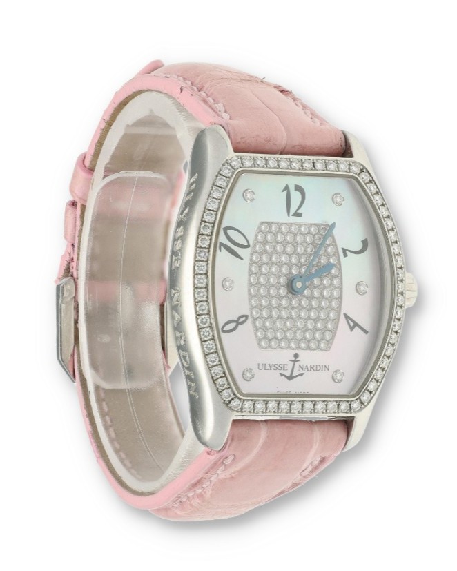 Eine weitere Uhr aus dem Nachlass ist ein Modell der Marke Ulysse Nardin mit Perlmutt-Zifferblatt, einem diamantbesetzten Edelstahlgehäuse und einem rosafarbenen Lederband. Der Schätzwert für diese Uhr liegt zwischen 1.200 und 1.800 Euro.