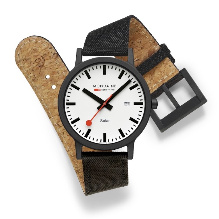 Das 41-mm-Gehäuse besteht aus einem Rizinusöl-Verbundwerkstoff, einer innovativen Materialzusammensetzung aus 40 Prozent Rizinusöl, 30 Prozent Glasfaser, 2 Prozent Farbpigmenten und nur 28 Prozent fossilem Öl für Stabilität und Langlebigkeit. Das Armband ist aus recyceltem PET-Textil gefertigt und mit einem Futter aus Naturkork versehen, welches Strapazierfähigkeit und Komfort vereint. Das Armband verfügt über ein Schnellverschlusssystem für mühelosen Wechsel und eine längere Produktlebensdauer. Die bewusste Entscheidung für die Verwendung nachhaltiger Materialien und das Solaruhrwerk spiegeln die Philosophie und das Engagement von Mondaine für durchdachte Nachhaltigkeit wider.