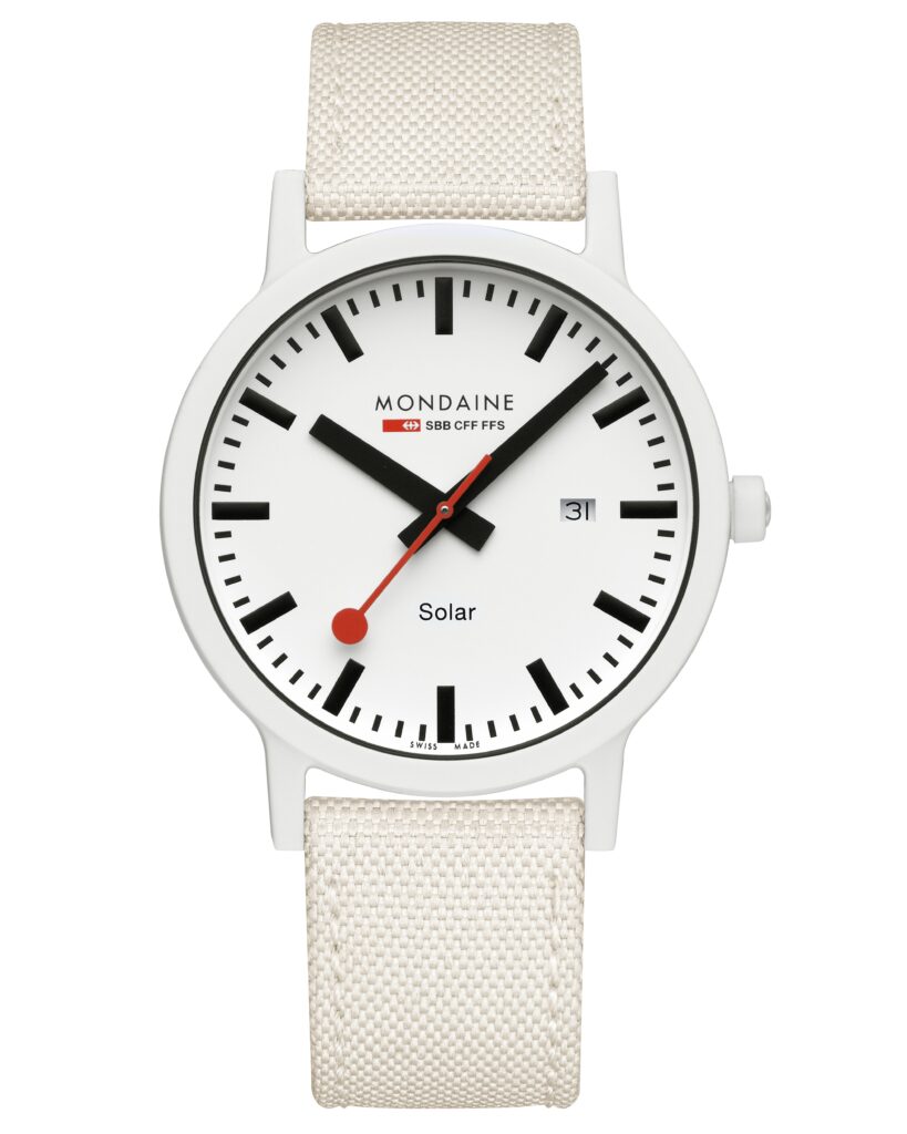 Die „essence solar“ ist in zwei Farbvarianten erhältlich: mit einem weißen Gehäuse samt elfenbeinfarbenem Armband sowie in einer sehr klassischen, minimalistischen Version in Schwarz. Die „essence solar“ Uhrenmodelle sind ein modernes Statement für Schweizer Innovation und Verantwortung. Sie werden in der Schweizer Fabrik von Mondaine in Biberist hergestellt und mit grüner Energie betrieben. Sie stellen unter Beweis, dass Nachhaltigkeit ikonisch, zuverlässig, schön und zudem auch sehr erschwinglich sein kann. Gut für unseren Planeten, gut für nachfolgende Generationen.