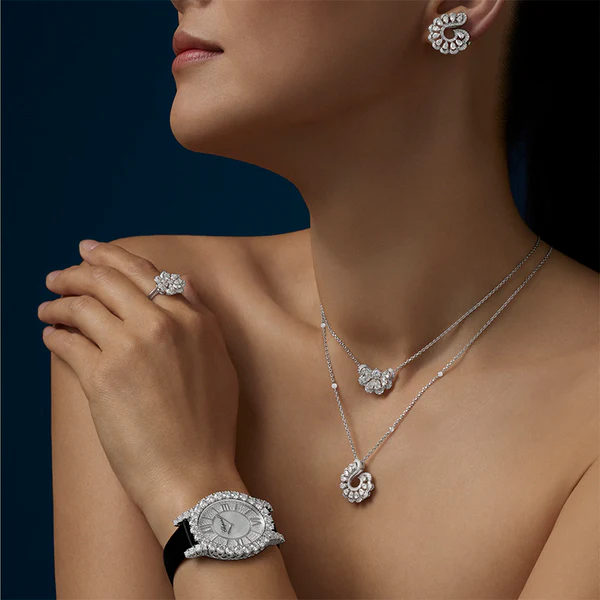 Parallel zur Uhr präsentiert Chopard neue Schmuckstücke innerhalb der Linie: Ohrhänger, Armreifen und Anhänger in floralen Formen, inspiriert von der natürlichen Brillanz des Diamanten. Die Stücke kombinieren tropfenförmig geschliffene Steine mit feinsten Goldstrukturen – ein Spiel aus Licht und Bewegung, das die Zeitmesser harmonisch ergänzt. Diese Synergie aus Juwelier- und Uhrmachertradition bleibt ein Alleinstellungsmerkmal der Kollektion.