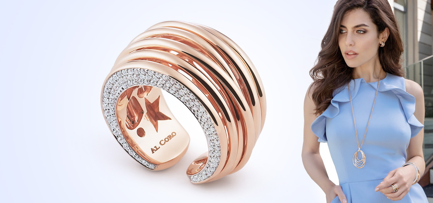 Die Kollektion erscheint in unterschiedlichen Goldtönen, und jeder Farbton erzählt eine eigene Geschichte. Roségold wirkt warm und weich, während Gelbgold die klare Form stärker betont. Weißgold hingegen setzt einen modernen, reduzierten Akzent. Diese Vielfalt erlaubt es, Mezzaluna besonders gut mit anderen AL-CORO-Linien zu kombinieren – etwa ICON oder Serenata. Dadurch entstehen spannende Layering-Looks, die den Halbmond als wiederkehrendes Motiv neu in Szene setzen.