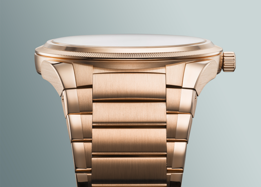 In Roségold entsteht ein subtiler Kontrast: Die warme Metallfarbe bringt die grünen Nuancen im Zifferblatt stärker zur Geltung und verleiht der Uhr zusätzliche Tiefe. Trotz der edleren Anmutung bleibt die Gesamtwirkung kontrolliert und ausgewogen – das Zifferblatt bleibt visuelles Zentrum.