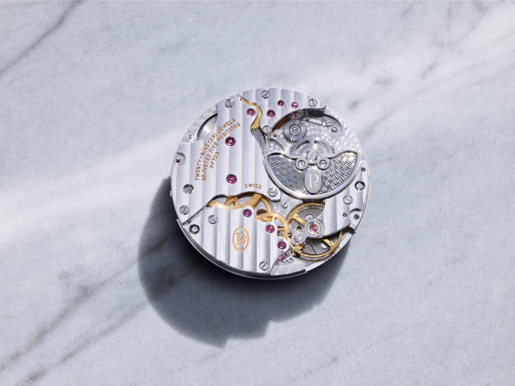Im Inneren arbeitet das automatische Manufakturkaliber PF703 mit integriertem Mikrorotor aus 950 Platin. Die Konstruktion ermöglicht eine geringe Bauhöhe bei 48 Stunden Gangreserve. 166 Komponenten, 29 Lagersteine sowie klassische Finissierungen wie Côtes de Genève, Perlage und anglierte Brücken spiegeln den uhrmacherischen Anspruch wider.