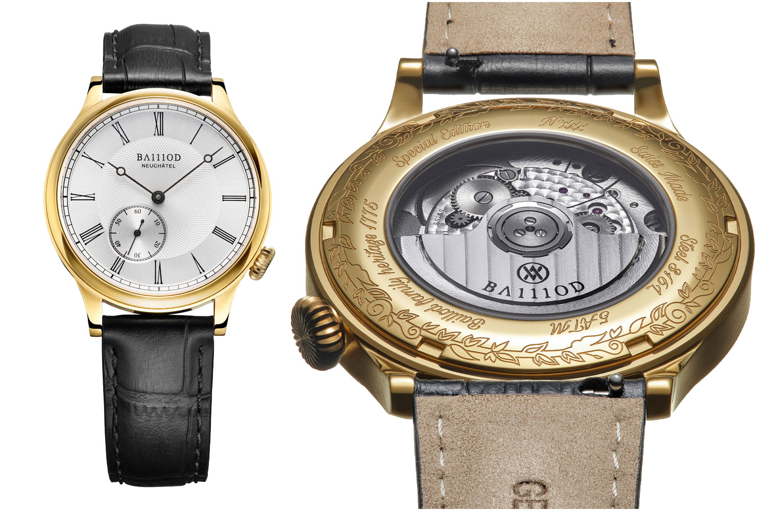 Materialien: Edelstahl, Gold-PVD-Beschichtung, Saphirglas Zifferblatt: Silberweiß, Sonnenschliff- und Guilloché-Finish Uhrwerk: Soprod C110, Automatik Gangreserve: 42 Stunden Gehäusemaße: 41 x 12,75 mm Wasserdichtigkeit: 5 bar Armband: Lederband Besonderheiten: Hommage an die jahrhundertealten uhrmacherischen Wurzeln der Familie Baillod UVP: 1.110 CHF