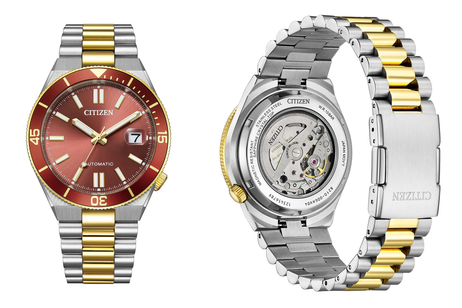 Materialien: Edelstahl, teilweise Gelbgoldbeschichtung, Saphirglas Zifferblatt: Korallenrot Uhrwerk: Miyota-Kaliber 8210, Automatik Gehäusemaße: 40 x 12,5 mm Wasserdichtigkeit: 10 bar Armband: Edelstahl, teilweise Gelbgoldbeschichtung Besonderheiten: Glasboden, einseitig drehbare Lünette UVP: 349 €