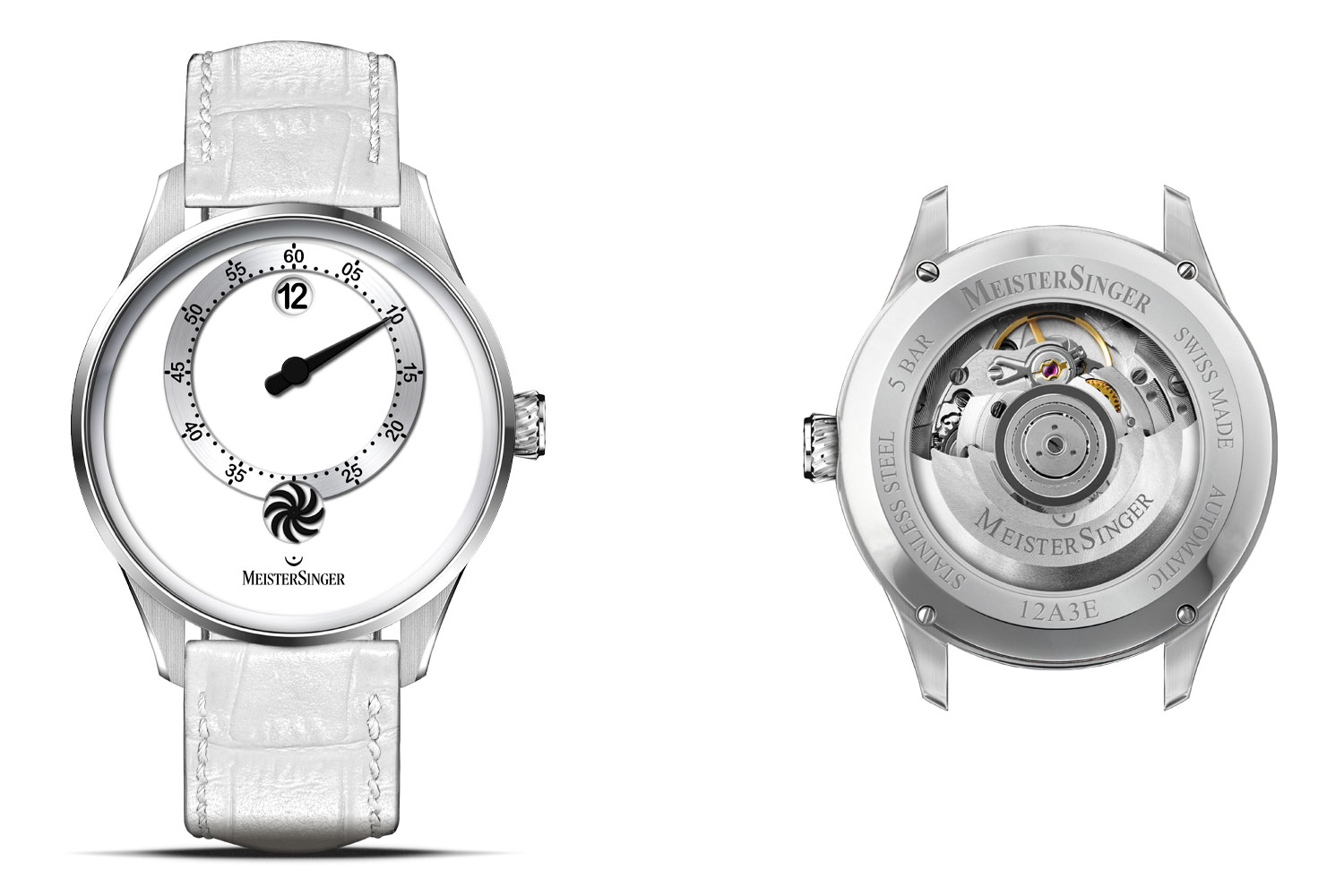 Zifferblatt: glänzend Weiß Materialien: Edelstahl, Saphirglas, Leder Uhrwerk: MS-JH-01 (Basis Sellita SW300 mit Modul für springende Stunde), Automatik Gangreserve: 47 Stunden Gehäusemaße: 40,5 x 11,25 mm Wasserdichtigkeit: 5 bar Armband: Lederband Besonderheiten: Einzeigeruhr, Springende Stunde, Sonnenrad, Glasboden UVP: 6.990 €