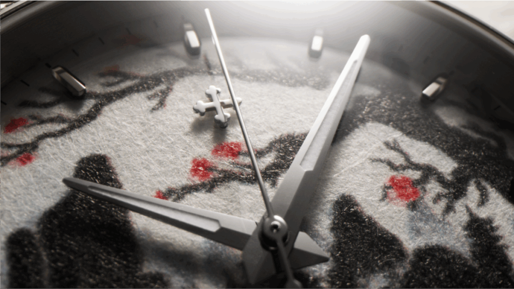 Gefertigt aus japanischem Washi-Papier und im fünfstufigen Tampondruck umgesetzt, greift das Zifferblatt die Ästhetik der Zen-Malerei auf. Berge und blühende Äste spiegeln sich in einer ruhigen Wasserlandschaft; jede Schattierung des Schwarztons bleibt durch die Textur des Papiers spürbar. Jede Drucklage ist final – eine Hommage an die Disziplin der traditionellen Maltechnik.