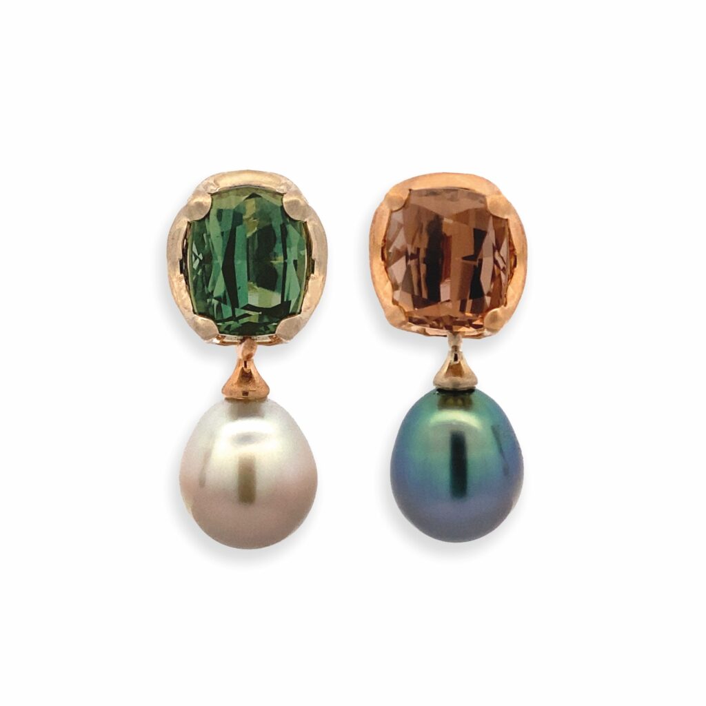 Left: "Dessert" earrings in a two-tone design made of pearls and colored gemstones. © Skrein*