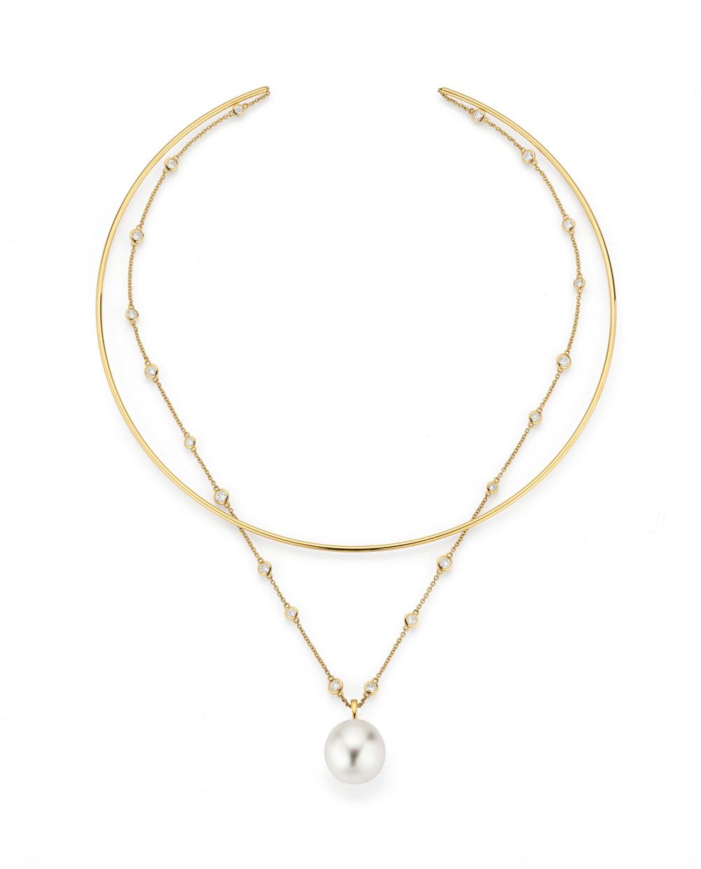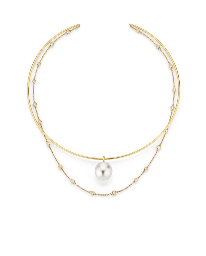 The model LO3 from the collection LOVE by Yana Nesper It consists of a 18k yellow gold choker set with 20 brilliant-cut diamonds (1.50 ct) and a South Sea pearl measuring 13–14 mm. Its versatility is particularly characteristic: the necklace can be styled in three different ways, thus adapting flexibly to individual style.