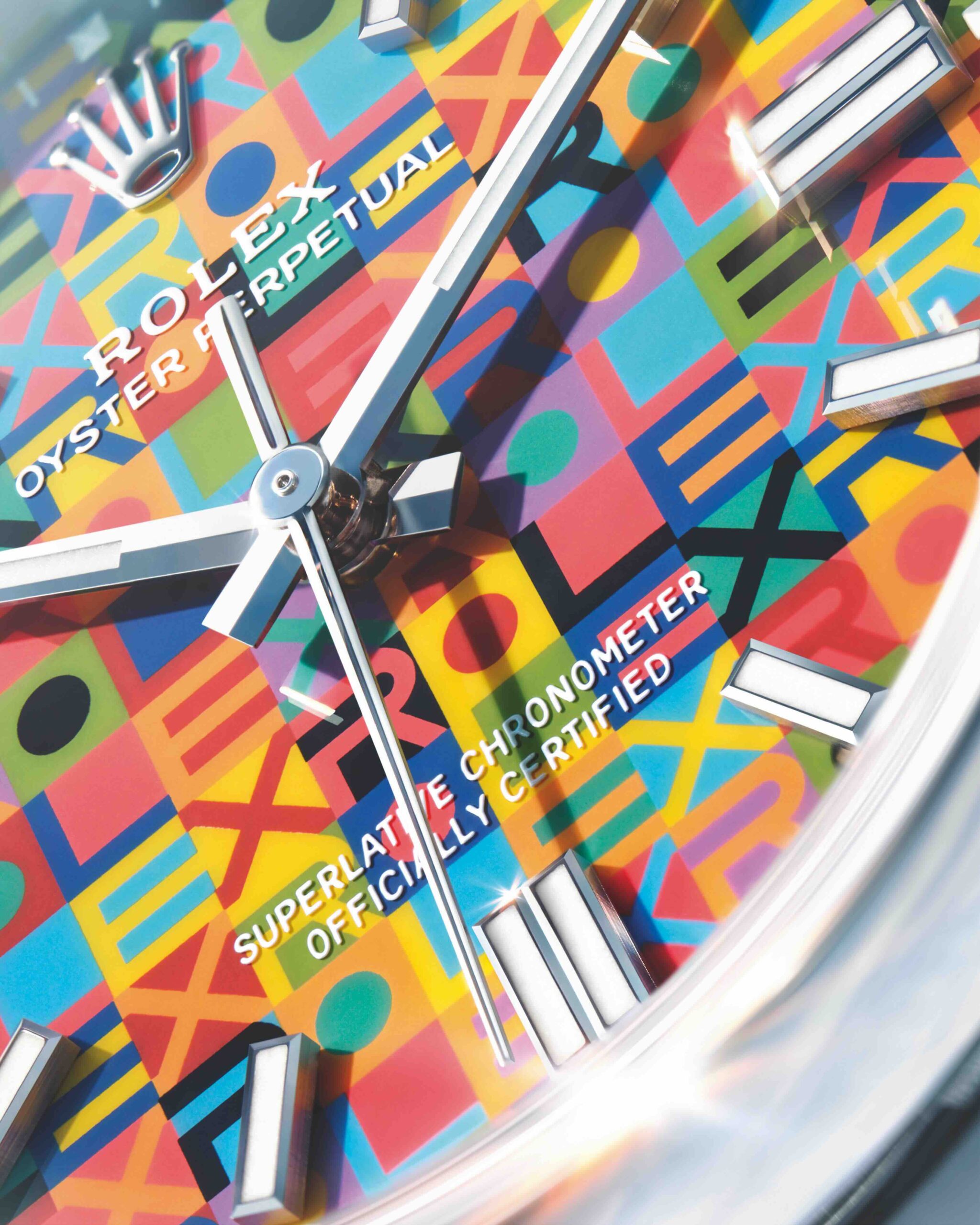The Oyster Perpetual 36 takes a far more expressive turn with its vibrant Jubilee dial. The letters of the Rolex name are reinterpreted graphically and applied in a complex multi-layer printing process. The result is a rarely seen combination of precision and visual dynamism.